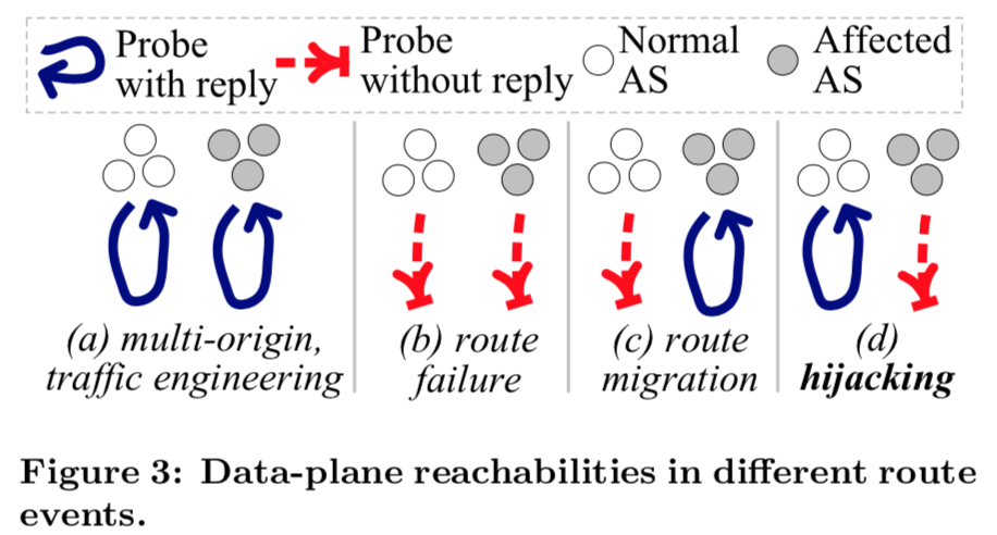 - When multi-origin (e.g., due to AS multi-homing, BGP anycast or static route) or traffic engineering is deployed, a new origin AS or new AS-path segments are introduced, and traffic may reach the destination prefix via different paths. In this case, both the normal ASes and the affected ASes can reach the destination prefix. (Fig. 3(a))
