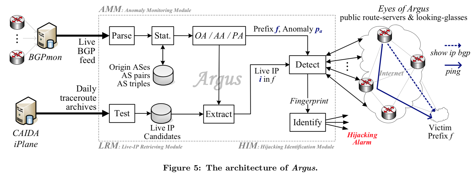 The Hijacking Identification Module (HIM) employs a number of public route-servers and looking-glasses, called as the eyes of Argus, to finally determine whether an anomaly detected by the AMM is actually a prefix hijacking or not. At each eye, Argus activates two processes, one for gathering the control-plane route status of the victim prefix , and the other for obtaining the data-plane reachability to the selected live IP .
