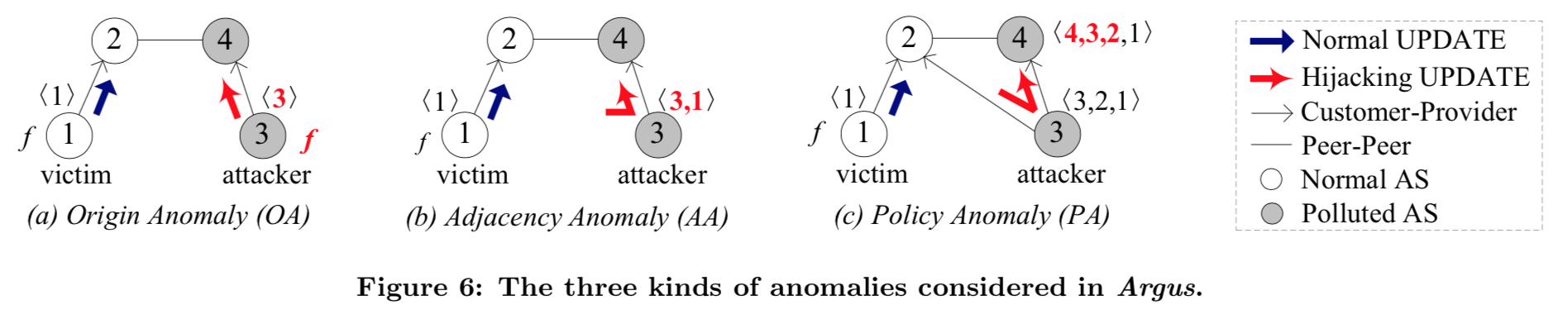 In Argus, we consider three types of route anomalies: origin anomalies (OA), adjacency anomalies (AA), and policy anomalies (PA), as illustrated in Fig. 6.