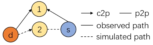 The absence of AS RIB-in data. The data reported by VPs sheds light on actual AS path choices but lacks insight into their RIB-in paths, pivotal in AS path selection decisions. It hampers our ability to infer the criteria ASes use to sort and select candidate paths, thereby impacting our understanding of AS routing behaviors. In the above figure, for AS paths originating from AS s and destined to AS s, the observed path <s,1,d > is believed to exist in the RIB-in table of AS s. However, we cannot confirm the existence of the simulated path<2,d > in the RIB-in table of AS s. The presence or absence of <2,d > carries significant implications for AS s's routing preferences. If <2,d > exists, AS s does not opt for the most economically optimal path from AS 2, suggesting that AS 1 is a special preference neighbor diverting AS s from the GR-Model. Conversely, if <2,d > does not exist, it implies that AS s adheres to the GR-Model and selects the economically optimal path, aligning with traditional assumptions. However, this scenario introduces another layer of complexity. It remains uncertain whether AS d did not announce its prefix to AS 2 or AS 2 did not convey the prefix to AS s. Such ambiguities, perplexing previous research efforts, lack definitive hypotheses. To address this challenge, we will use PathRadar to simulate the AS RIB-in path to avoid inappropriate assumptions.